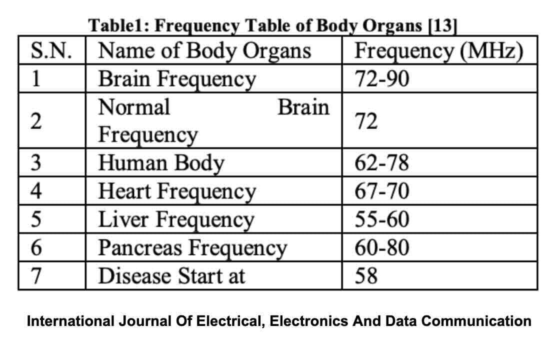 “It is confirmed that every organ has its own frequency-based spectrum, but according to analysis, the frequency of the human body is not stable; it varies on some parameters like environmental, physically fitness, etc. There are many parameters in which the body's organs change their frequency in a specific range. Every organ of a body is linked to another organ.”